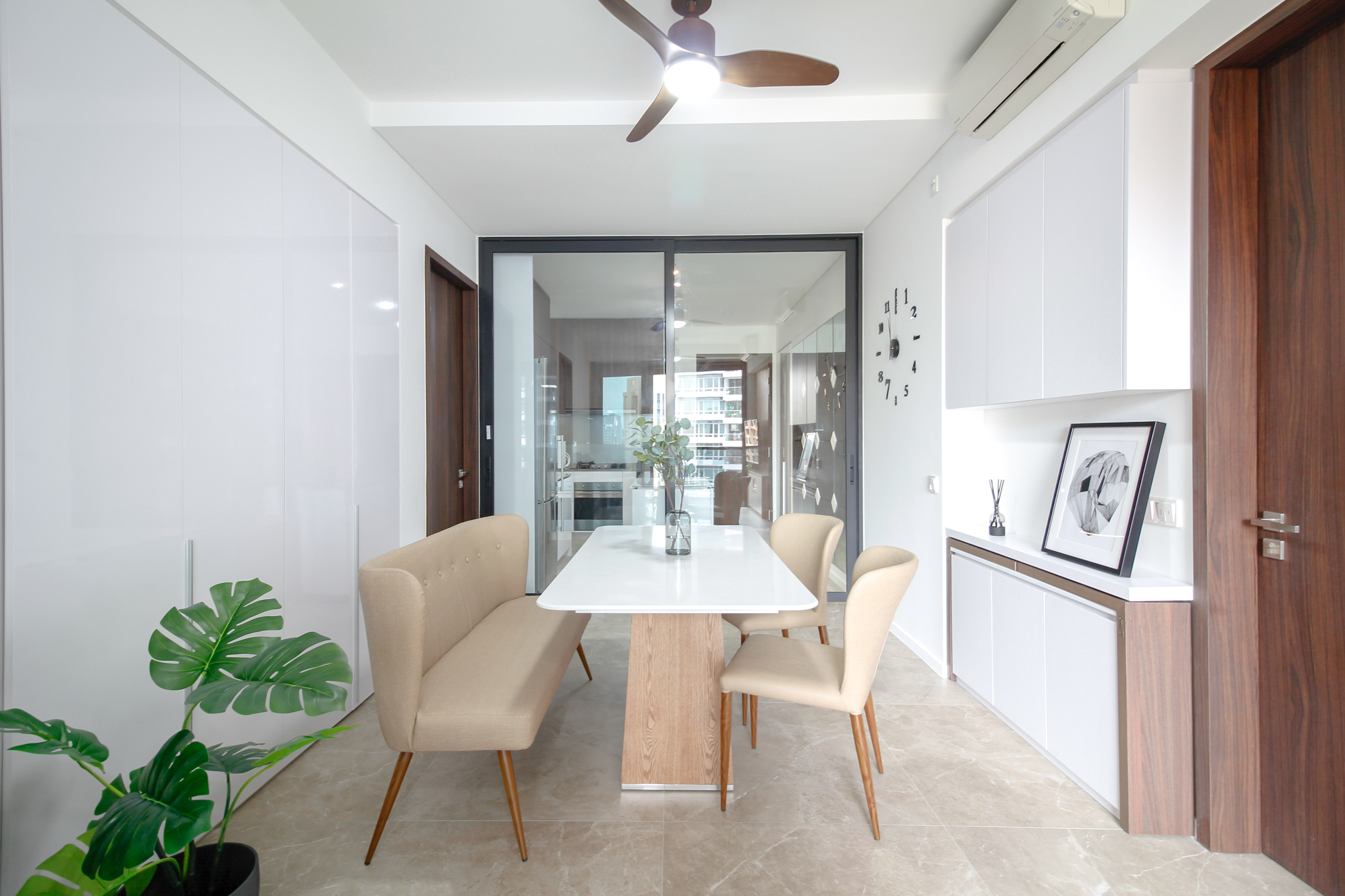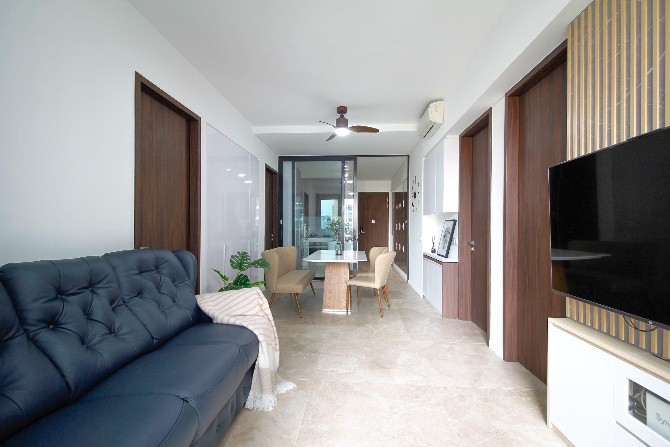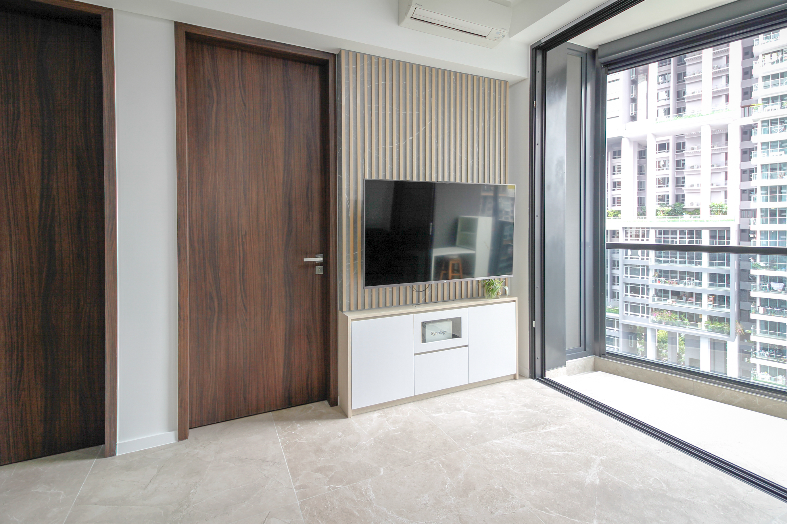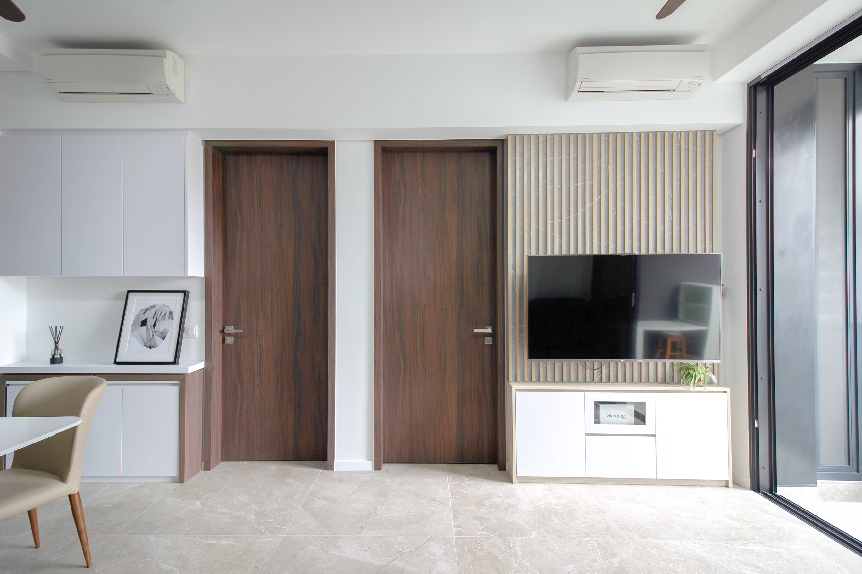 We’ve added a fluted panel feature wall with a TV cabinet into the living area - but with a twist. Both bedrooms feature platform beds with integrated storage options, with the junior bedroom even packing an attached, built-in study desk and storage cabinet for extra practicality!
