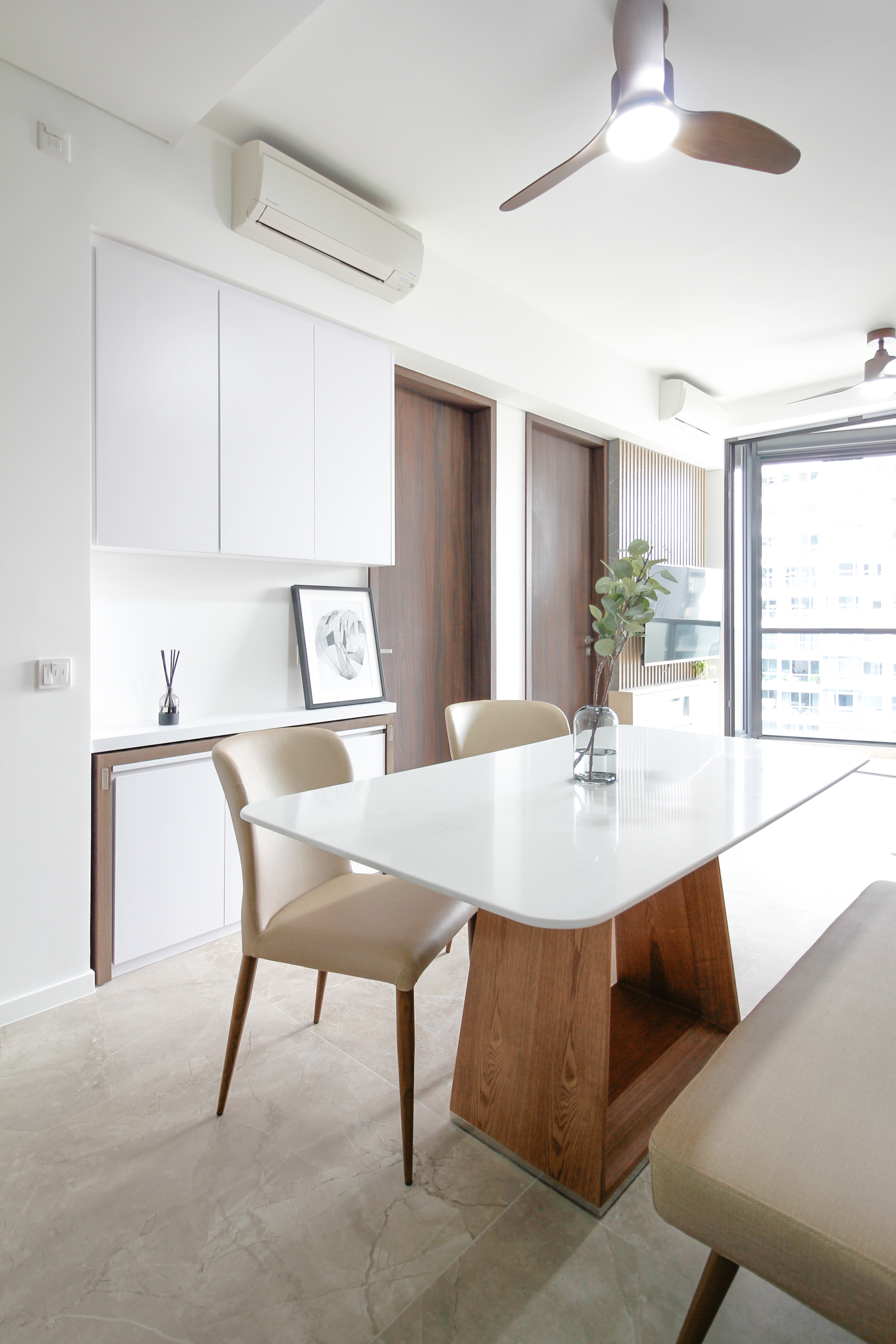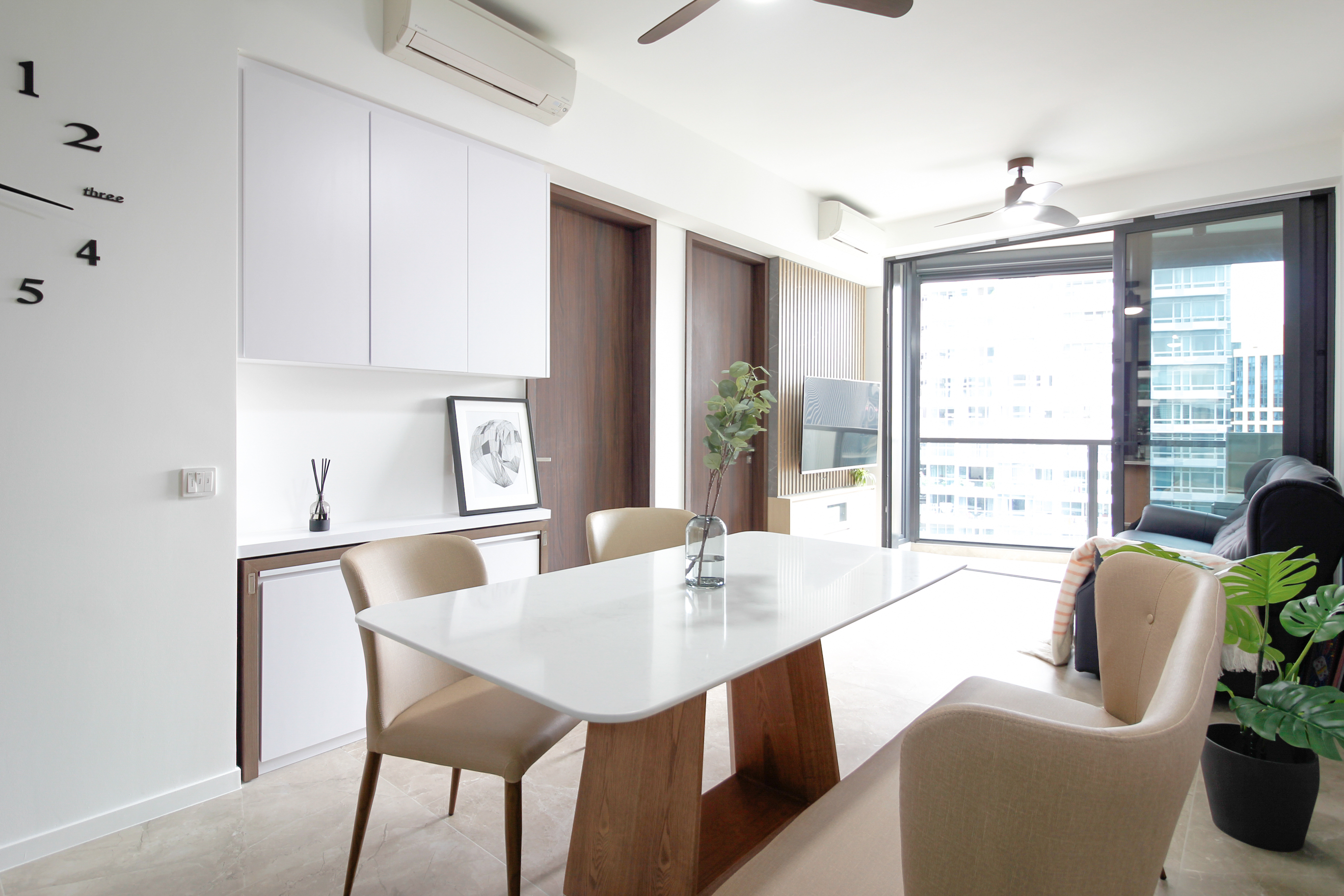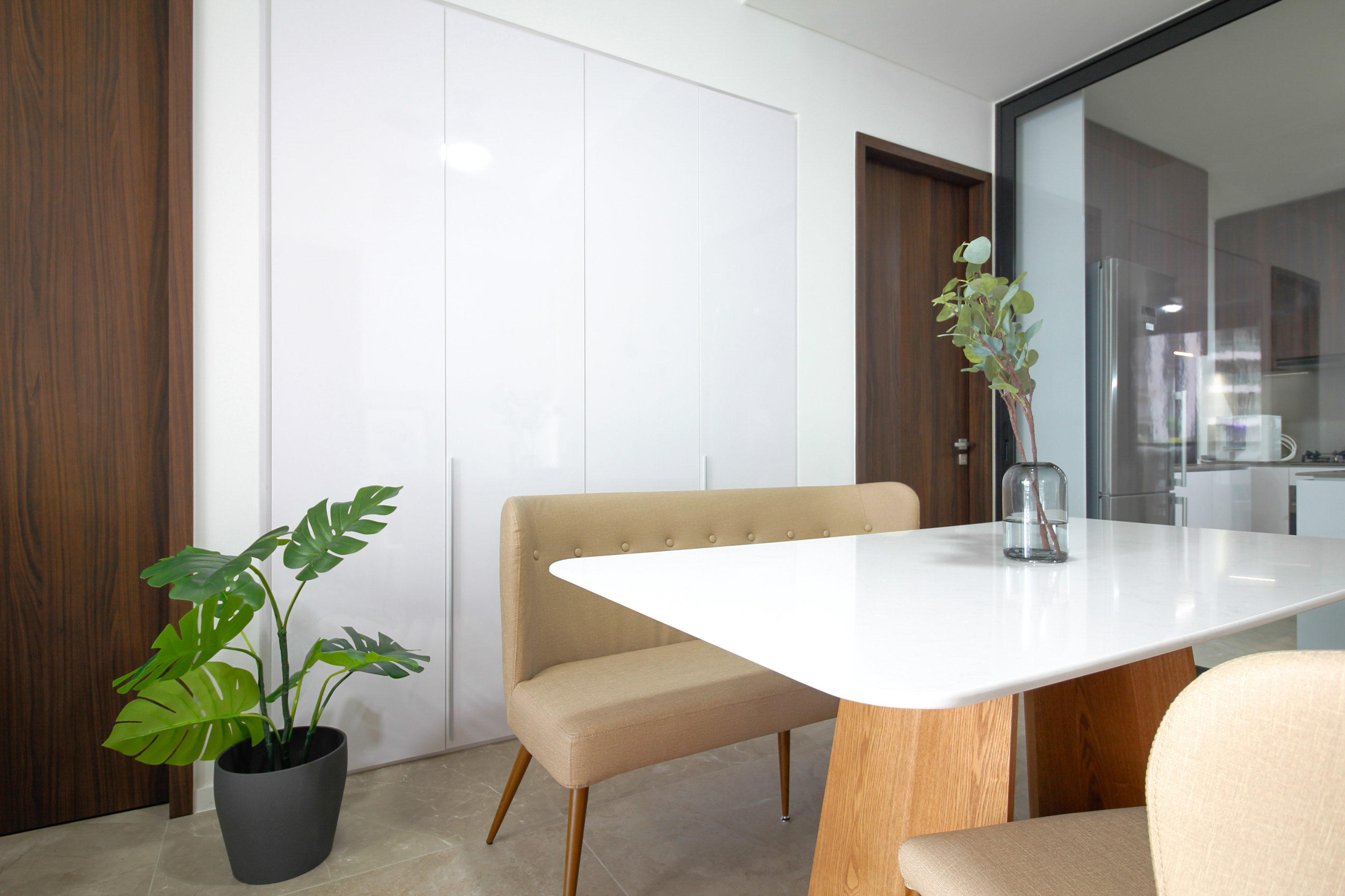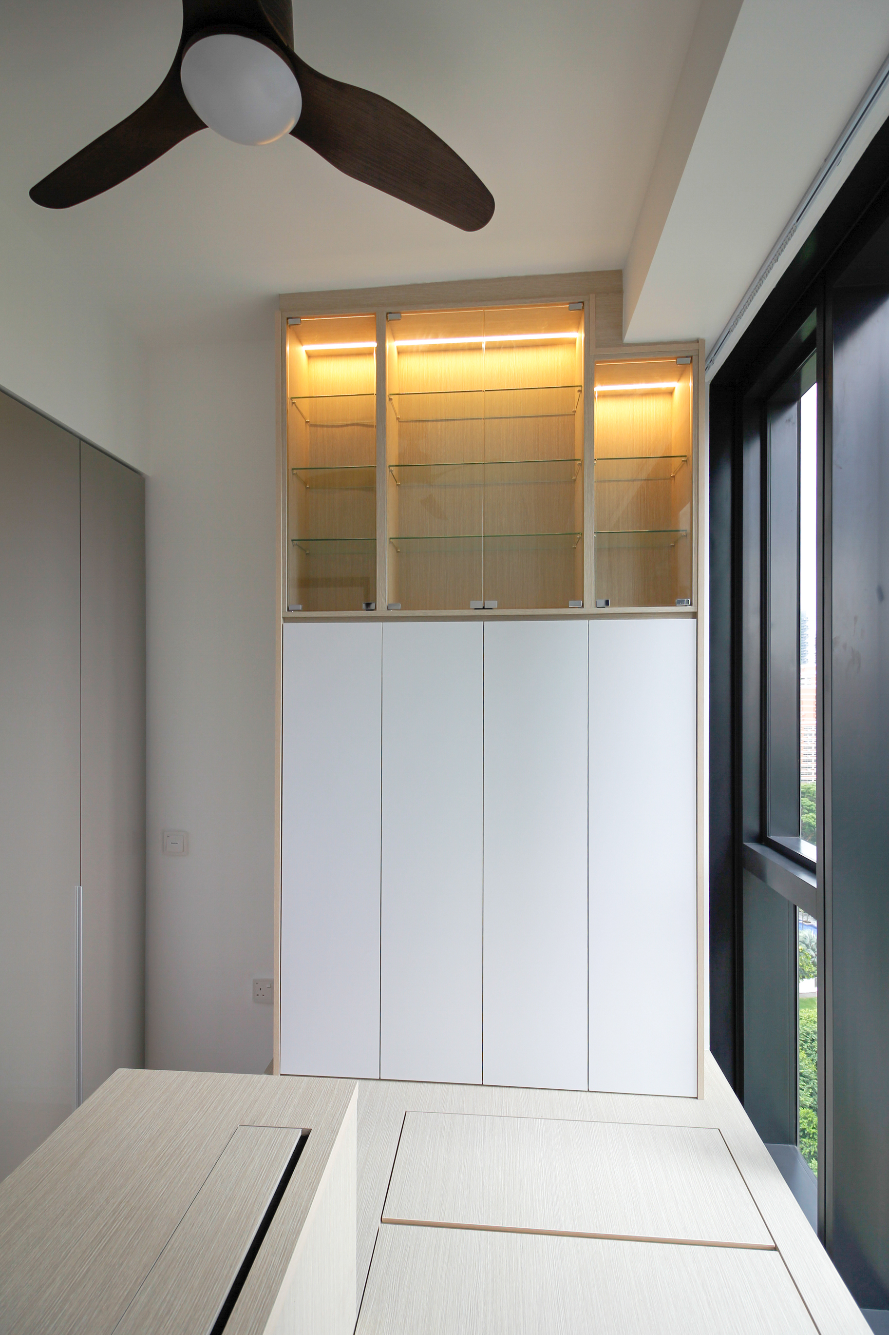 We’ve added a fluted panel feature wall with a TV cabinet into the living area - but with a twist. Both bedrooms feature platform beds with integrated storage options, with the junior bedroom even packing an attached, built-in study desk and storage cabinet for extra practicality!