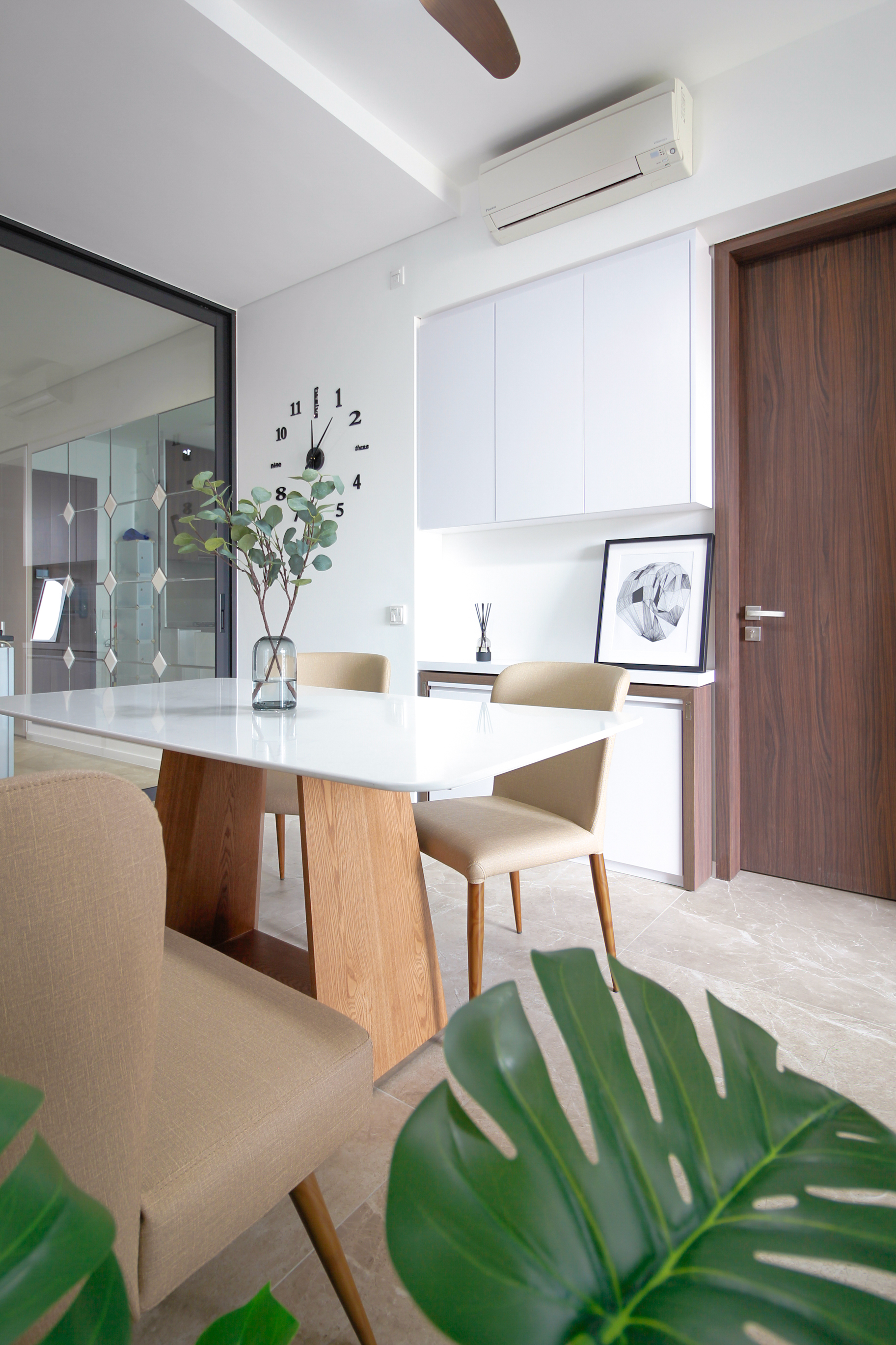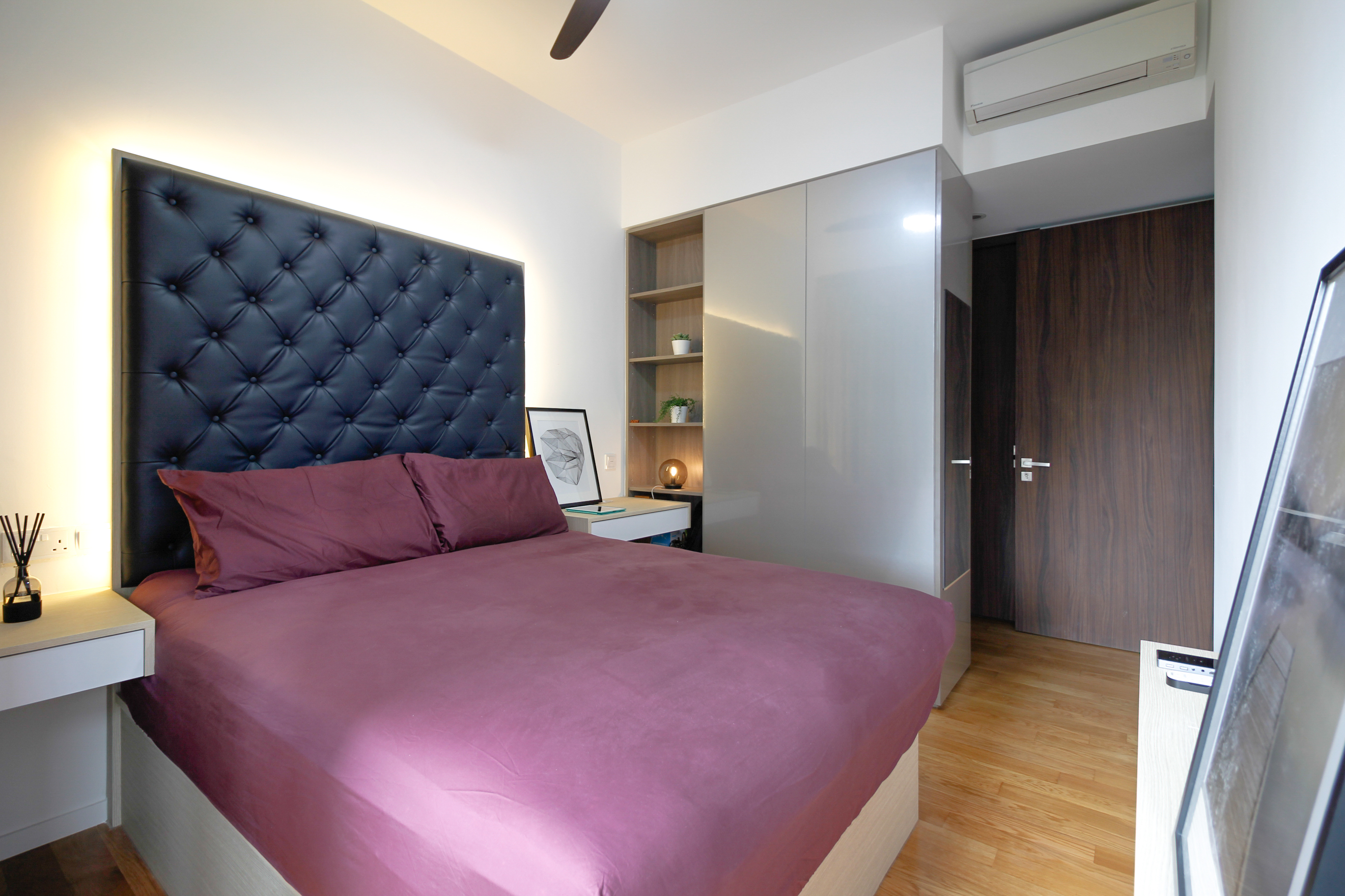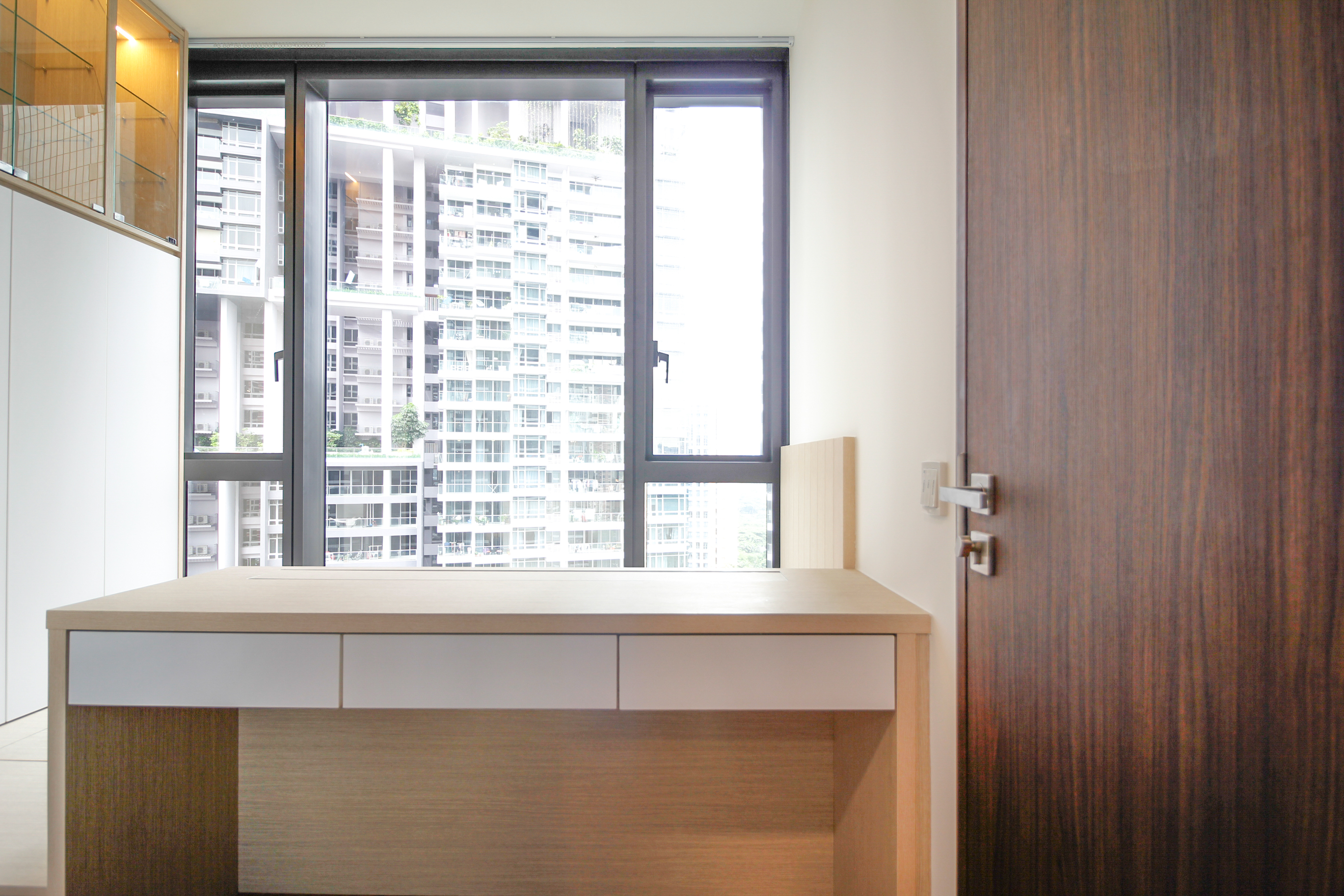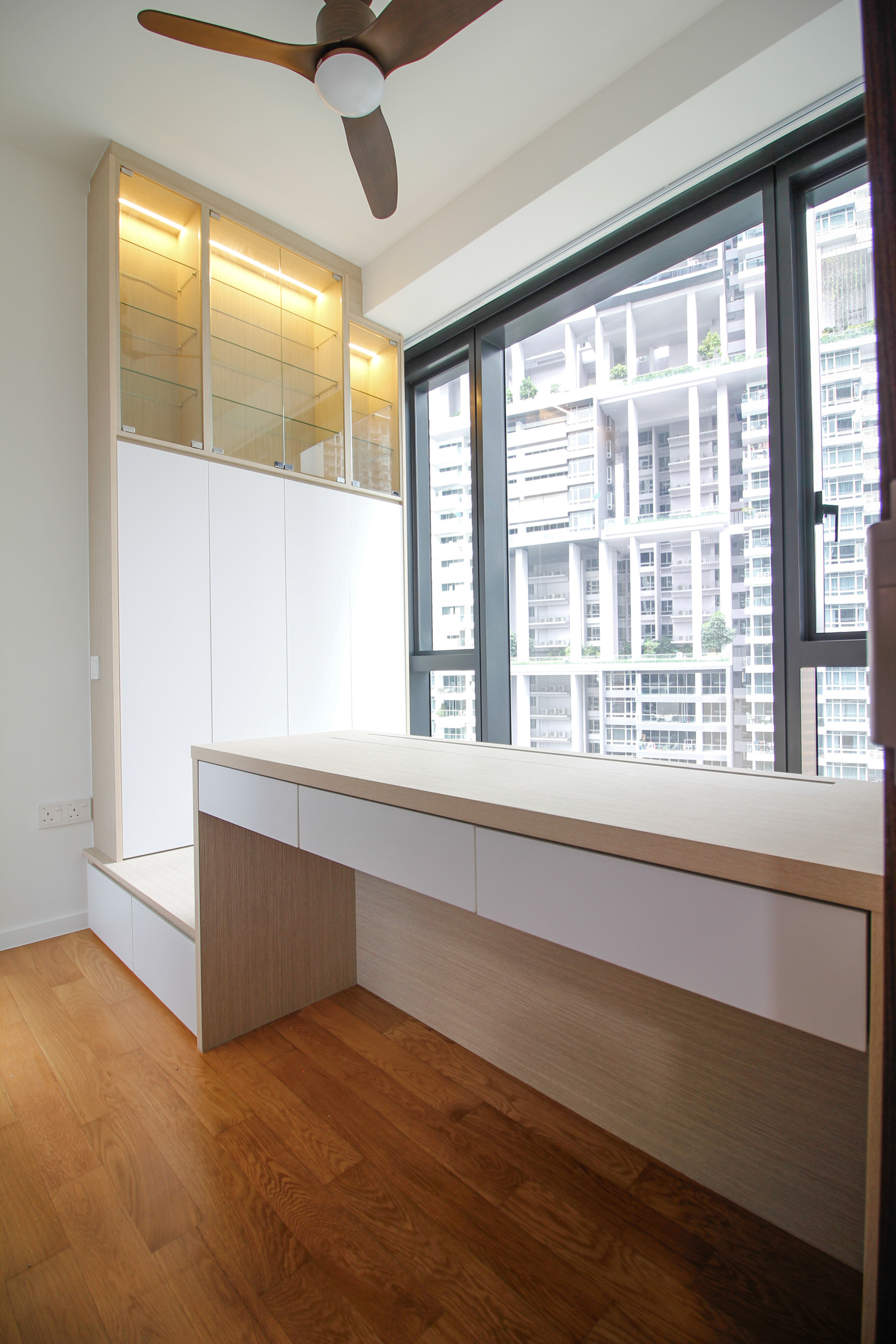 We’ve added a fluted panel feature wall with a TV cabinet into the living area - but with a twist. Both bedrooms feature platform beds with integrated storage options, with the junior bedroom even packing an attached, built-in study desk and storage cabinet for extra practicality!