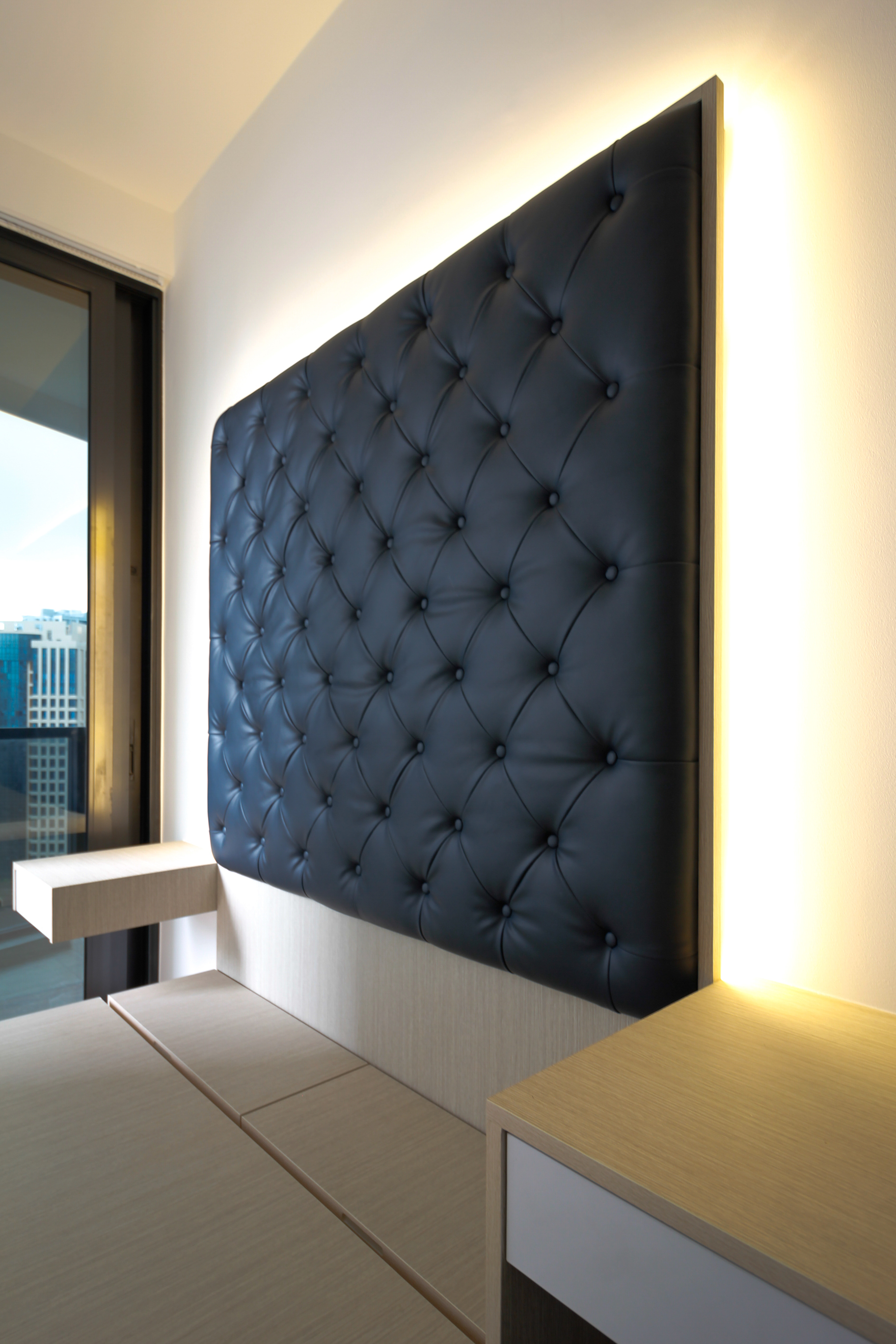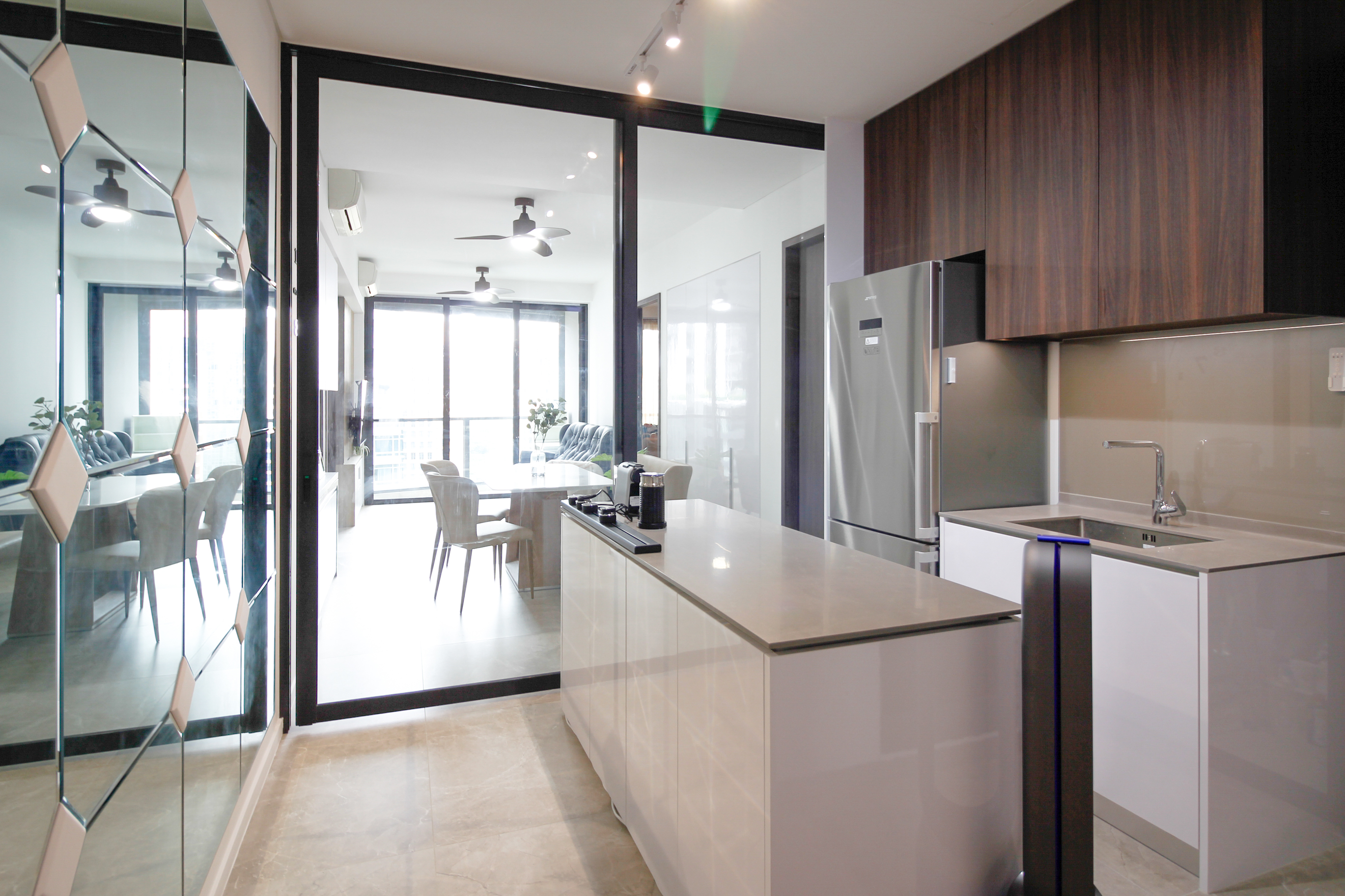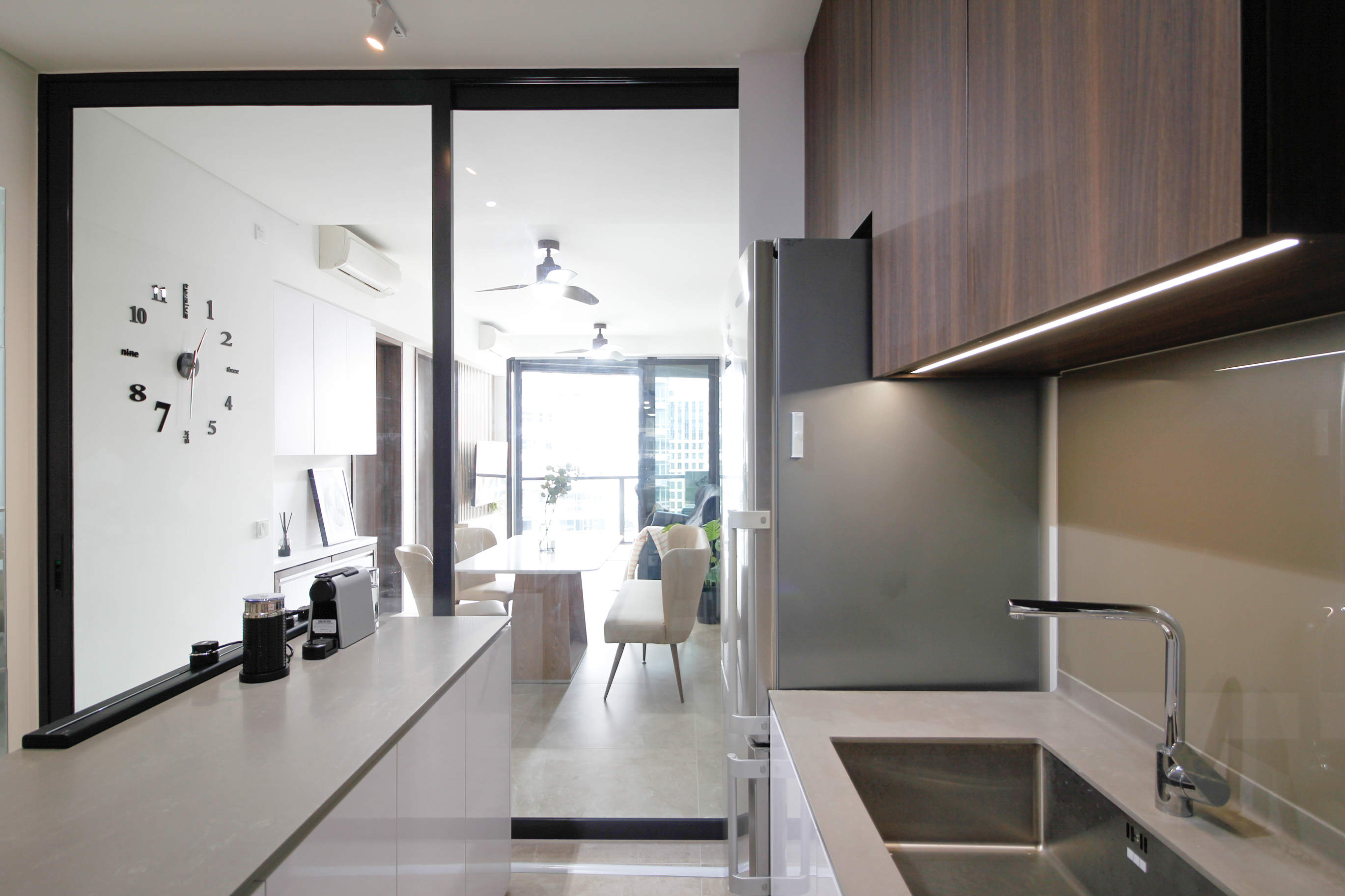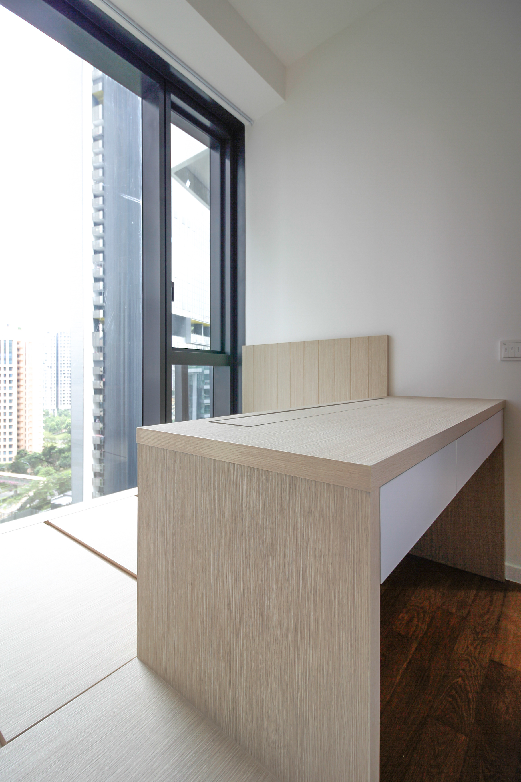 We’ve added a fluted panel feature wall with a TV cabinet into the living area - but with a twist. Both bedrooms feature platform beds with integrated storage options, with the junior bedroom even packing an attached, built-in study desk and storage cabinet for extra practicality!