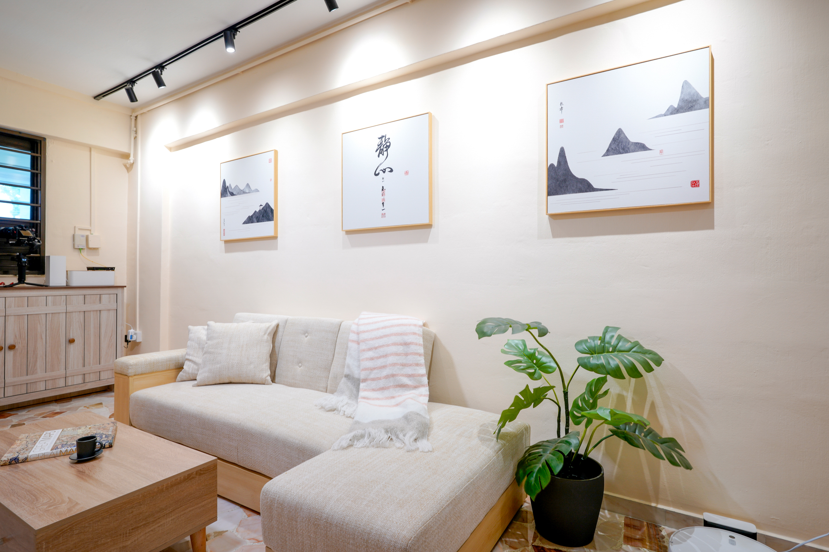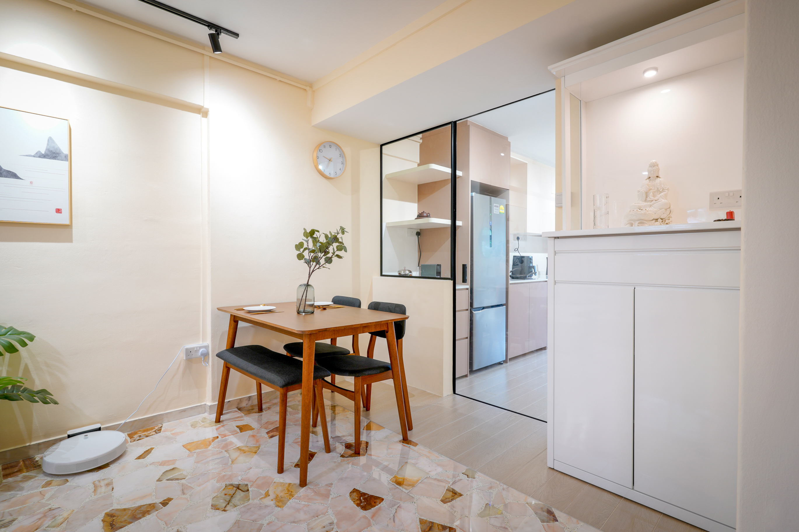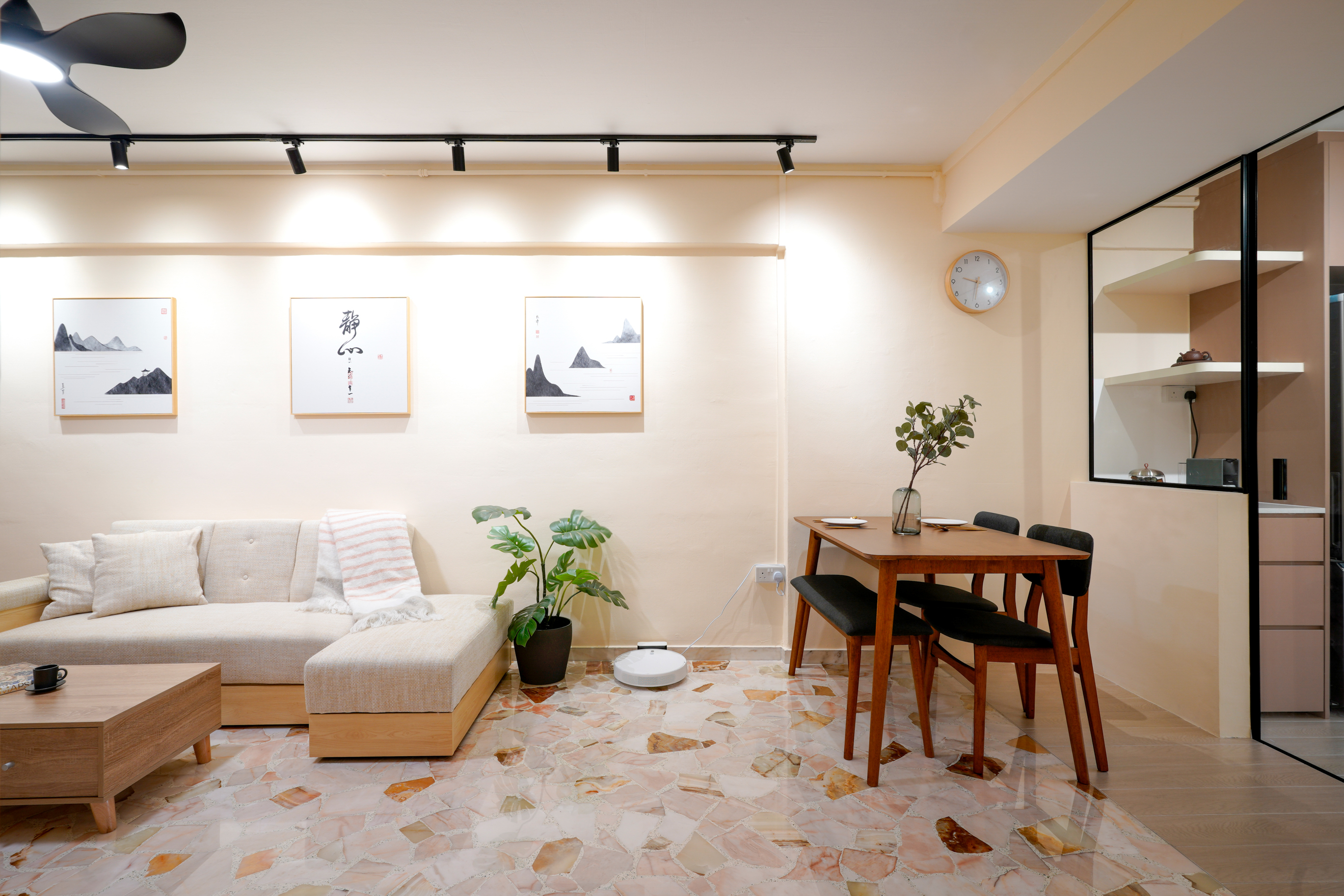We created a subtle zen vibe in this interior space with the use of various natural hues. The unit's original Terrazzo flooring was preserved, polished to a luster to give it a new lease of life. The kitchen flooring level was raised to match the height of the living areas, then tiled with wood-effect tiles as a nod to the zen-inspired theme. This area is then finished off with carpentry in various earthy shades, completing the overall cohesiveness of the space!