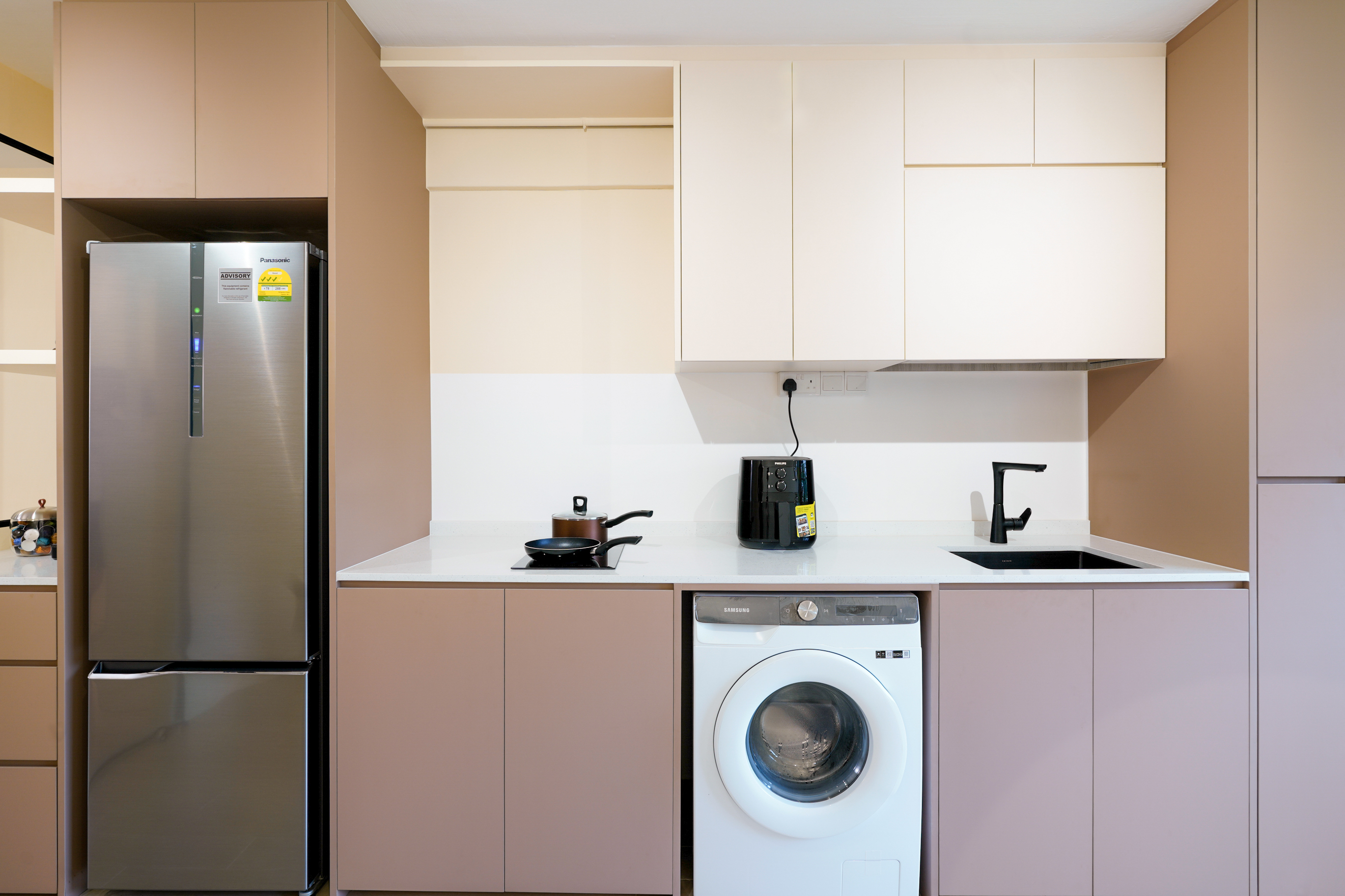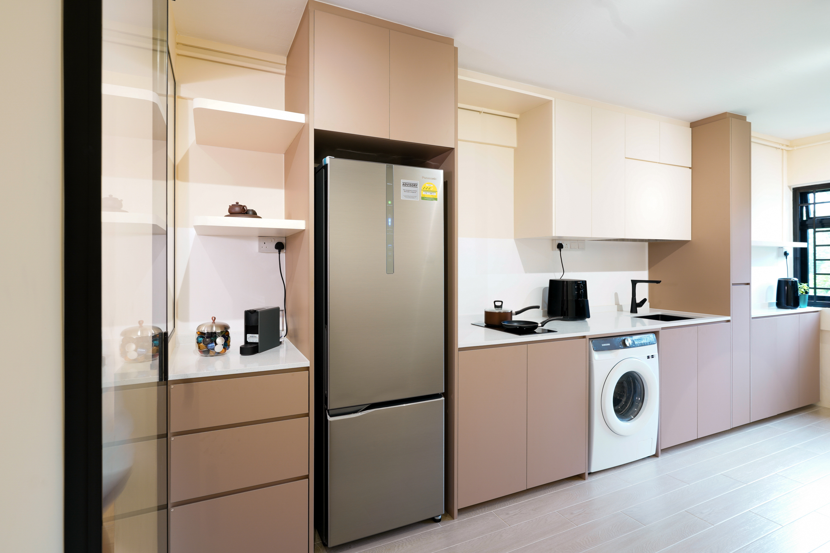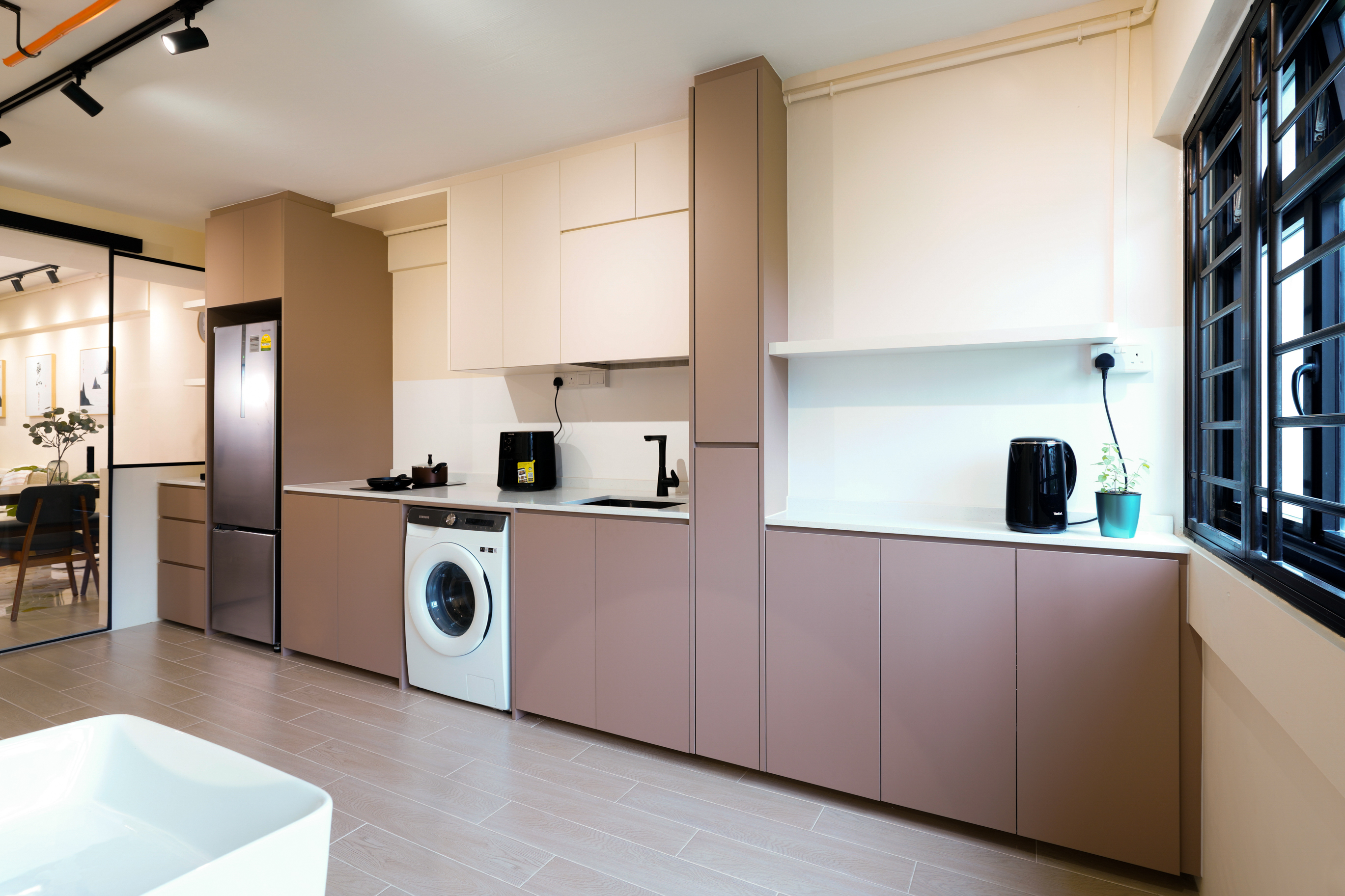 We created a subtle zen vibe in this interior space with the use of various natural hues. The unit's original Terrazzo flooring was preserved, polished to a luster to give it a new lease of life. The kitchen flooring level was raised to match the height of the living areas, then tiled with wood-effect tiles as a nod to the zen-inspired theme. This area is then finished off with carpentry in various earthy shades, completing the overall cohesiveness of the space!