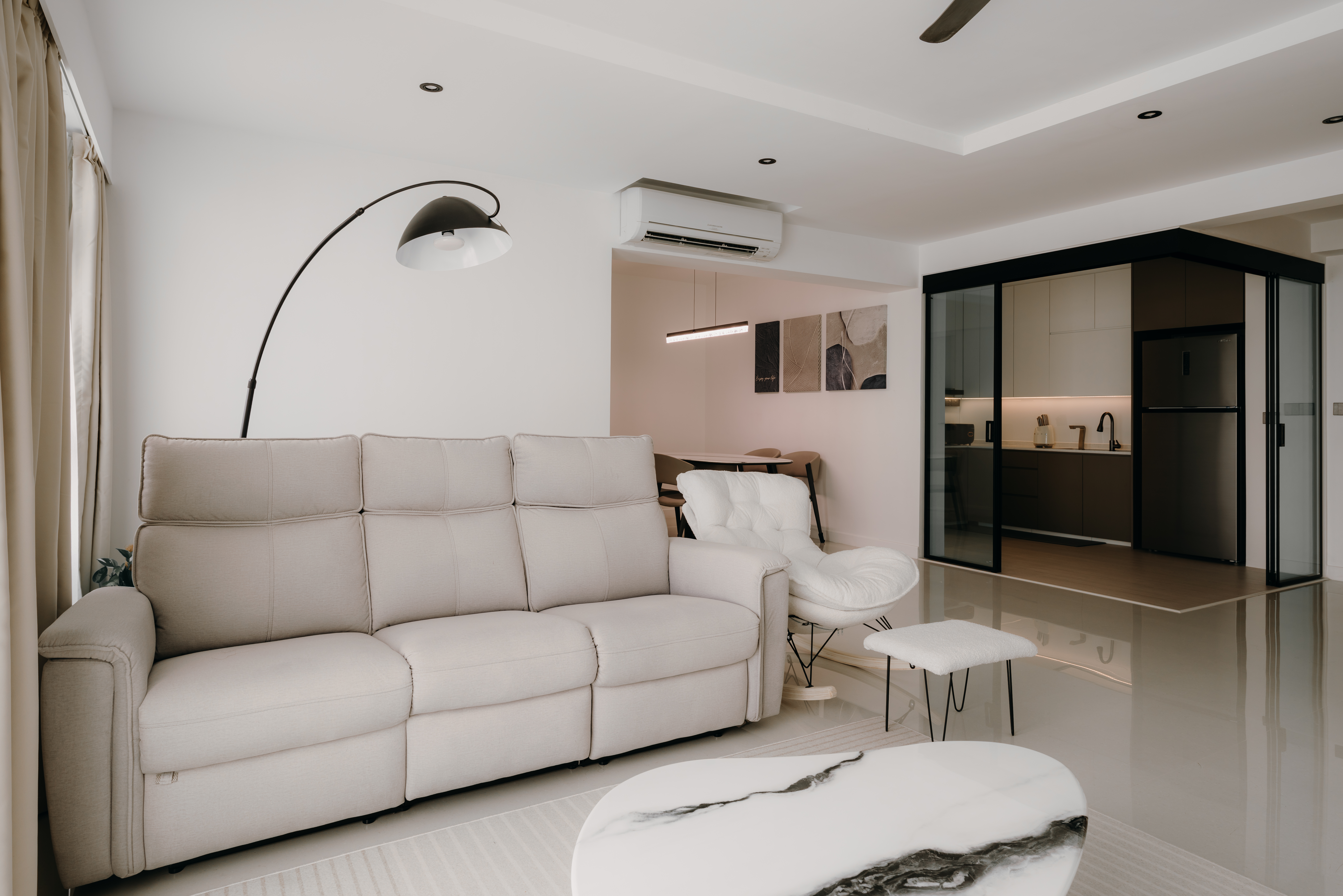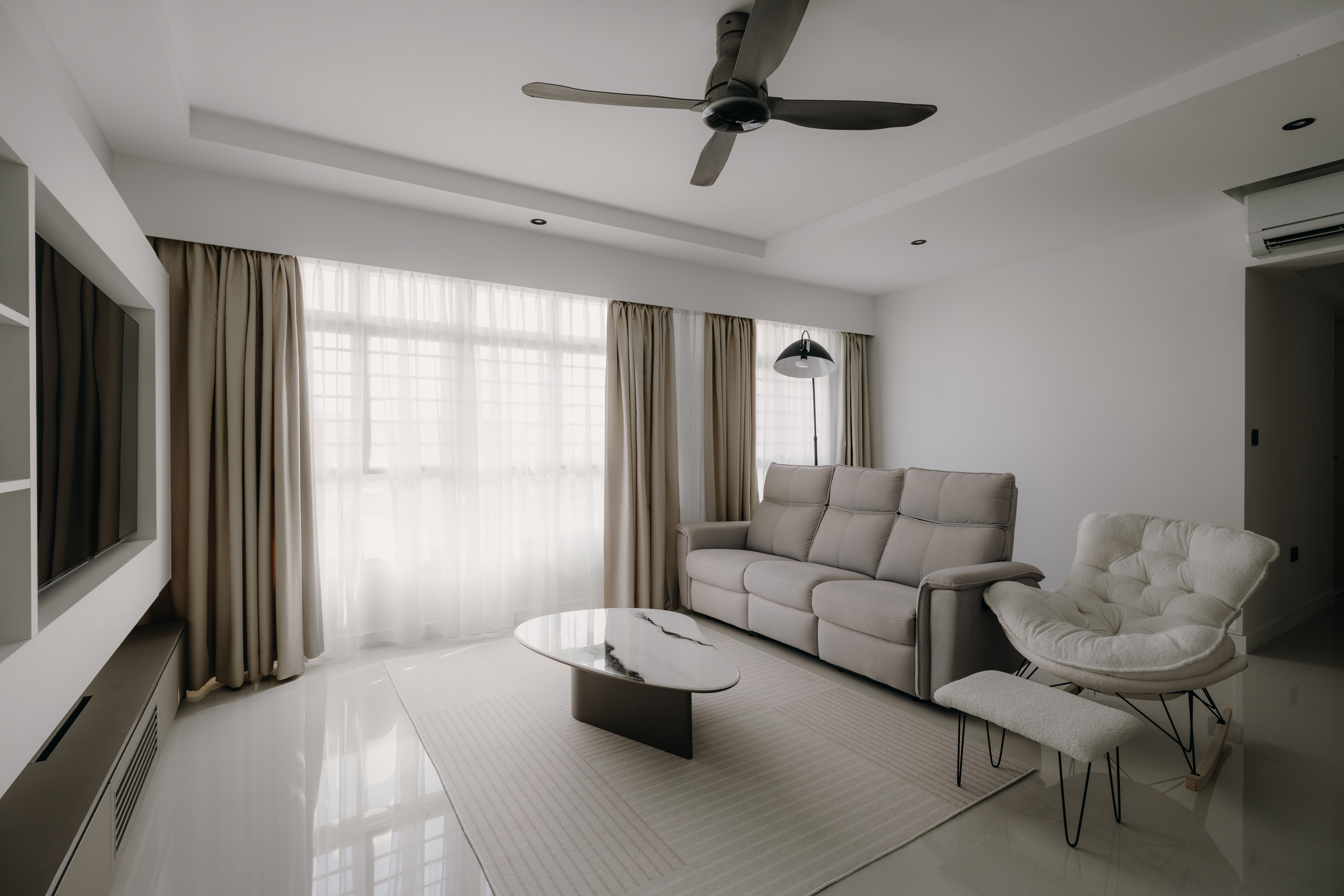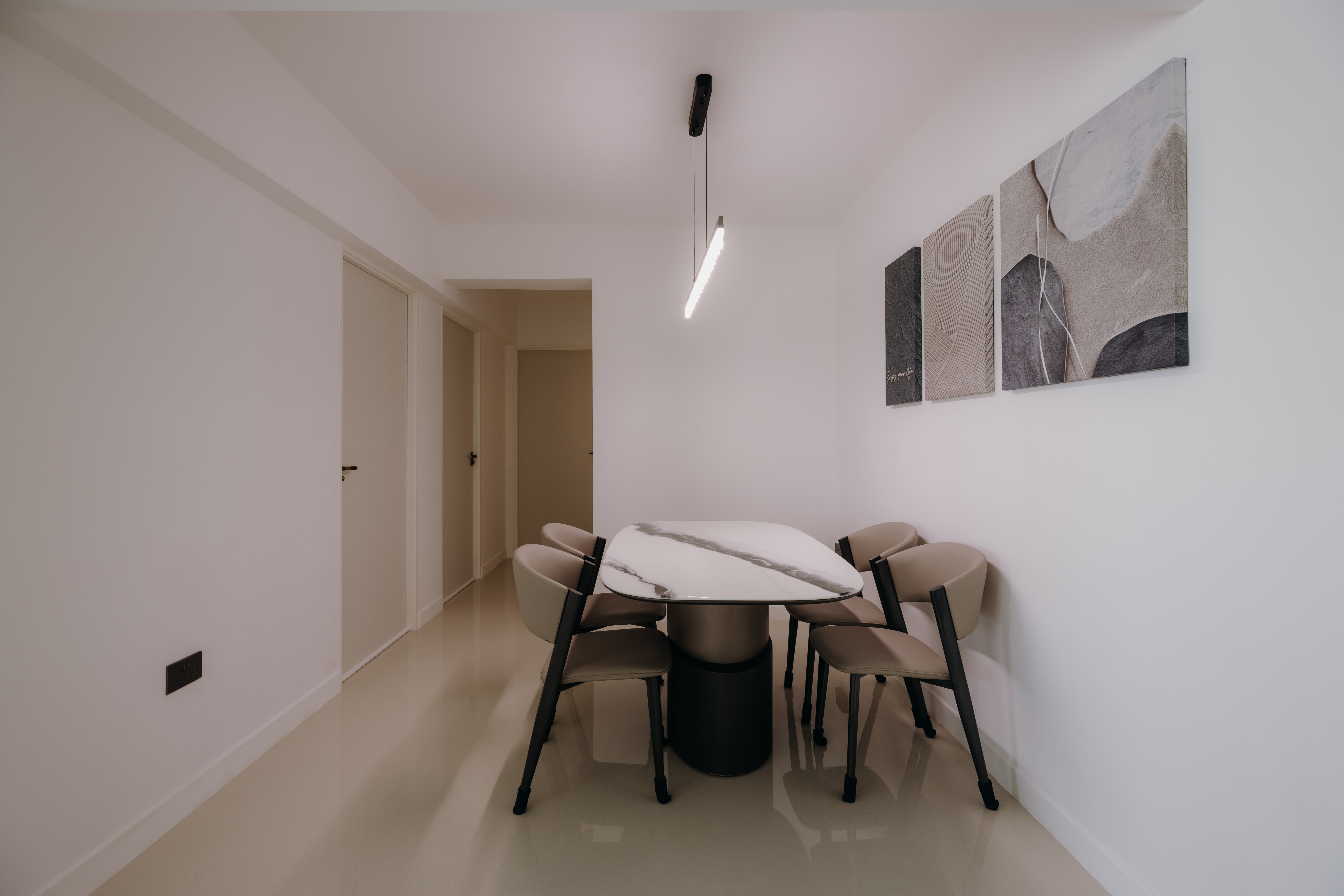 In the Monochromatic Muse, simplicity takes center stage, seamlessly paired with a richness of texture and understated luxury. We meticulously balance varying shades of cool whites and profound charcoals, utilizing textural contrasts in materials like polished concrete, matte finishes, sleek metals, and soft linens to create visual interest without clutter.