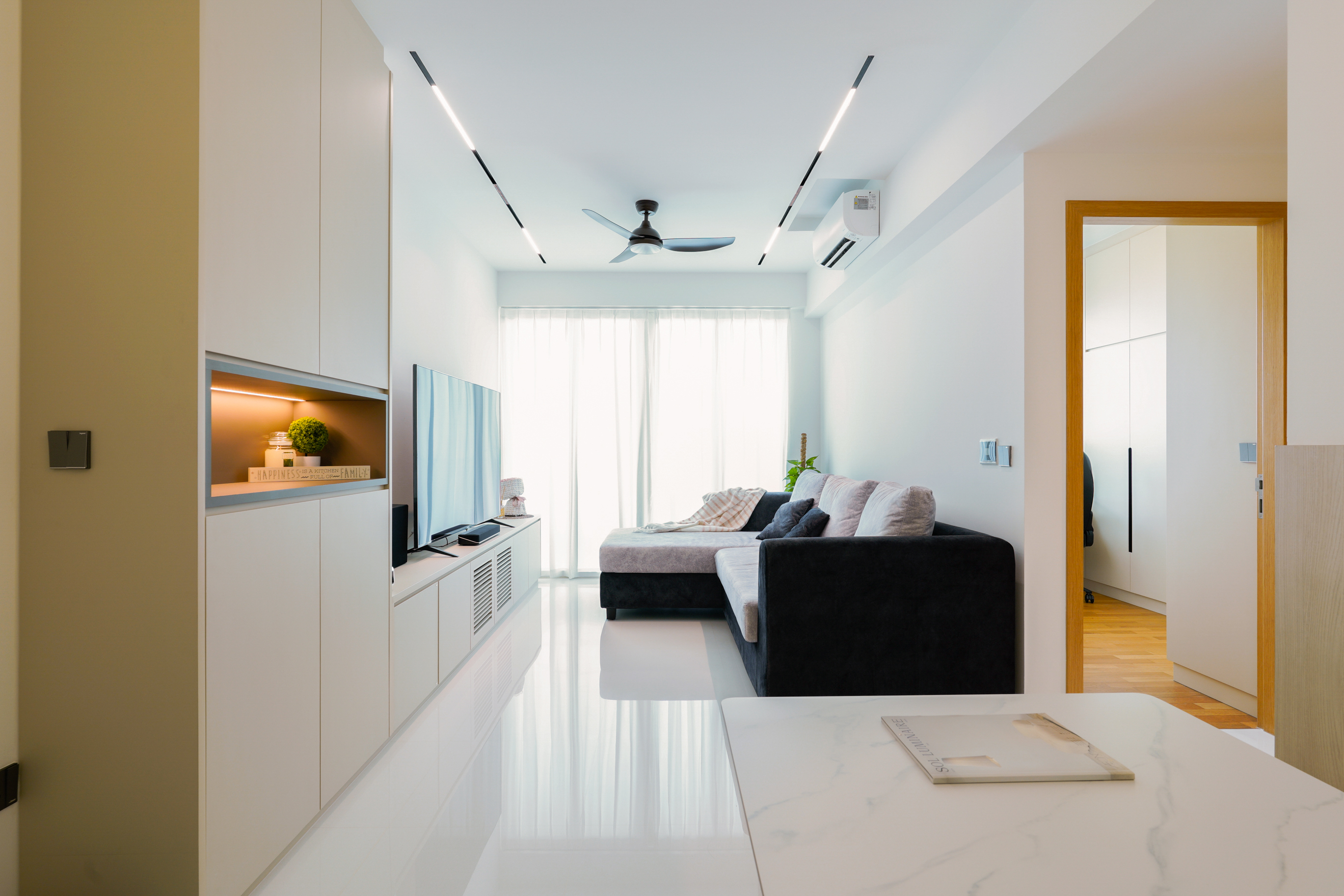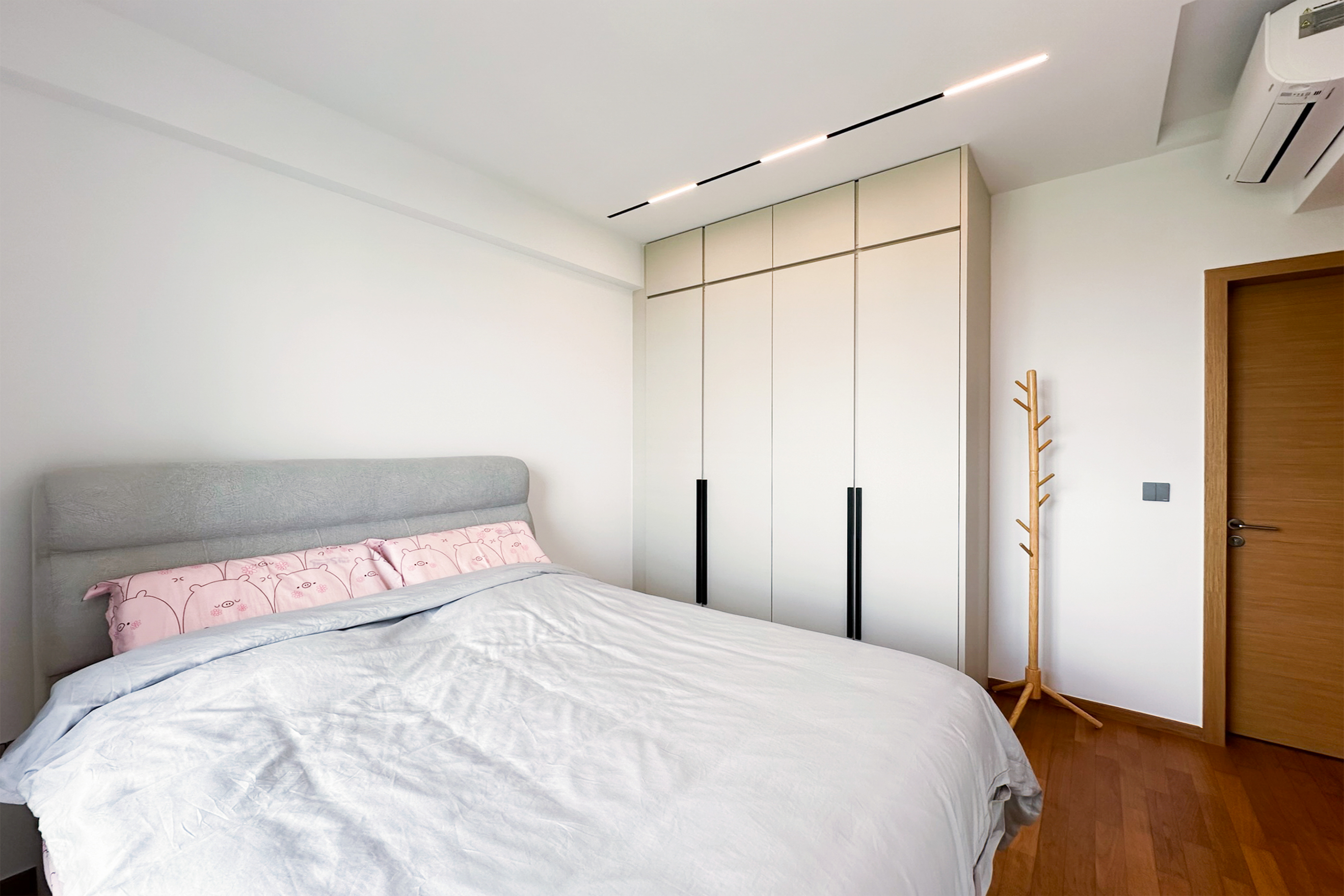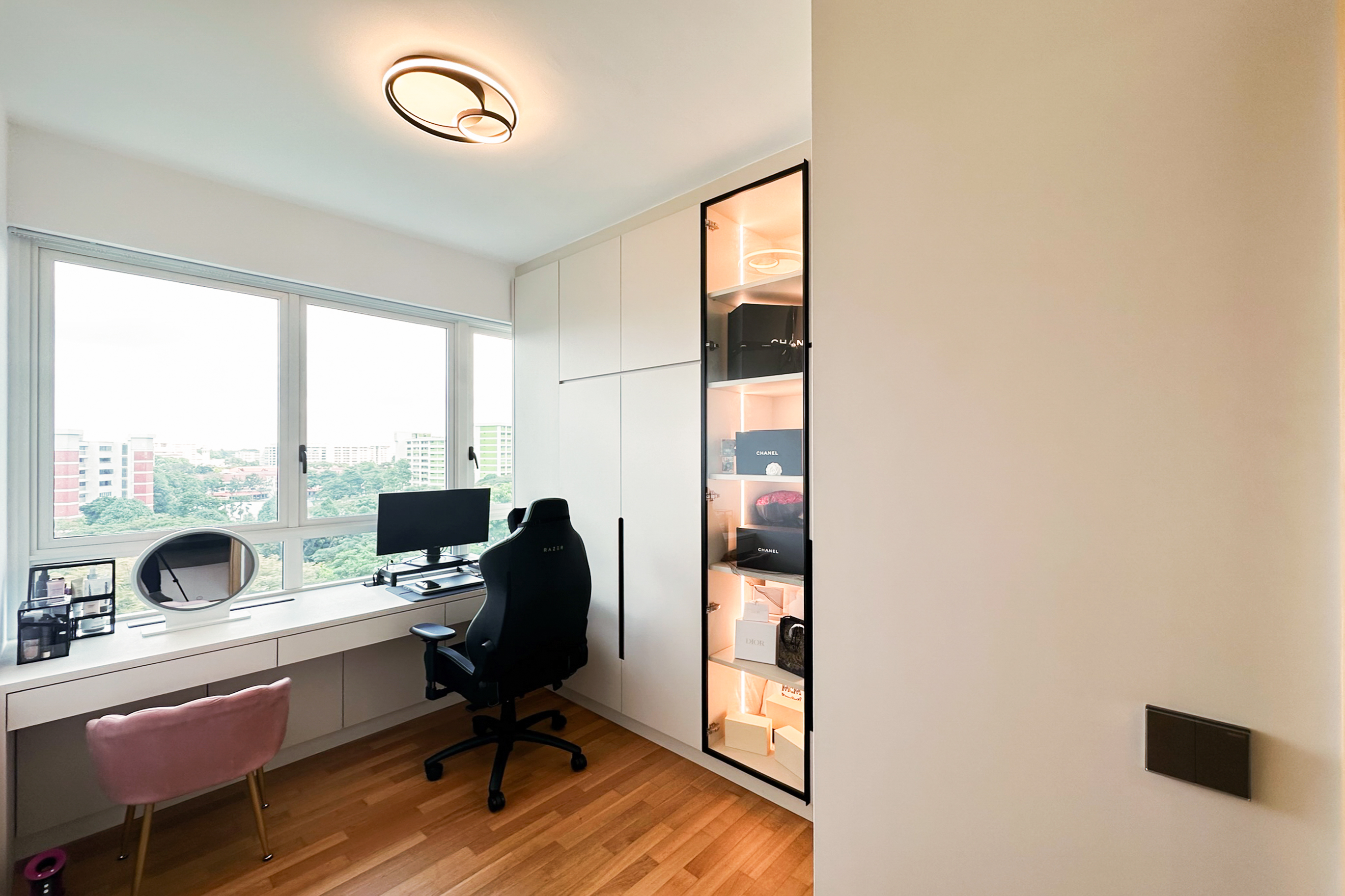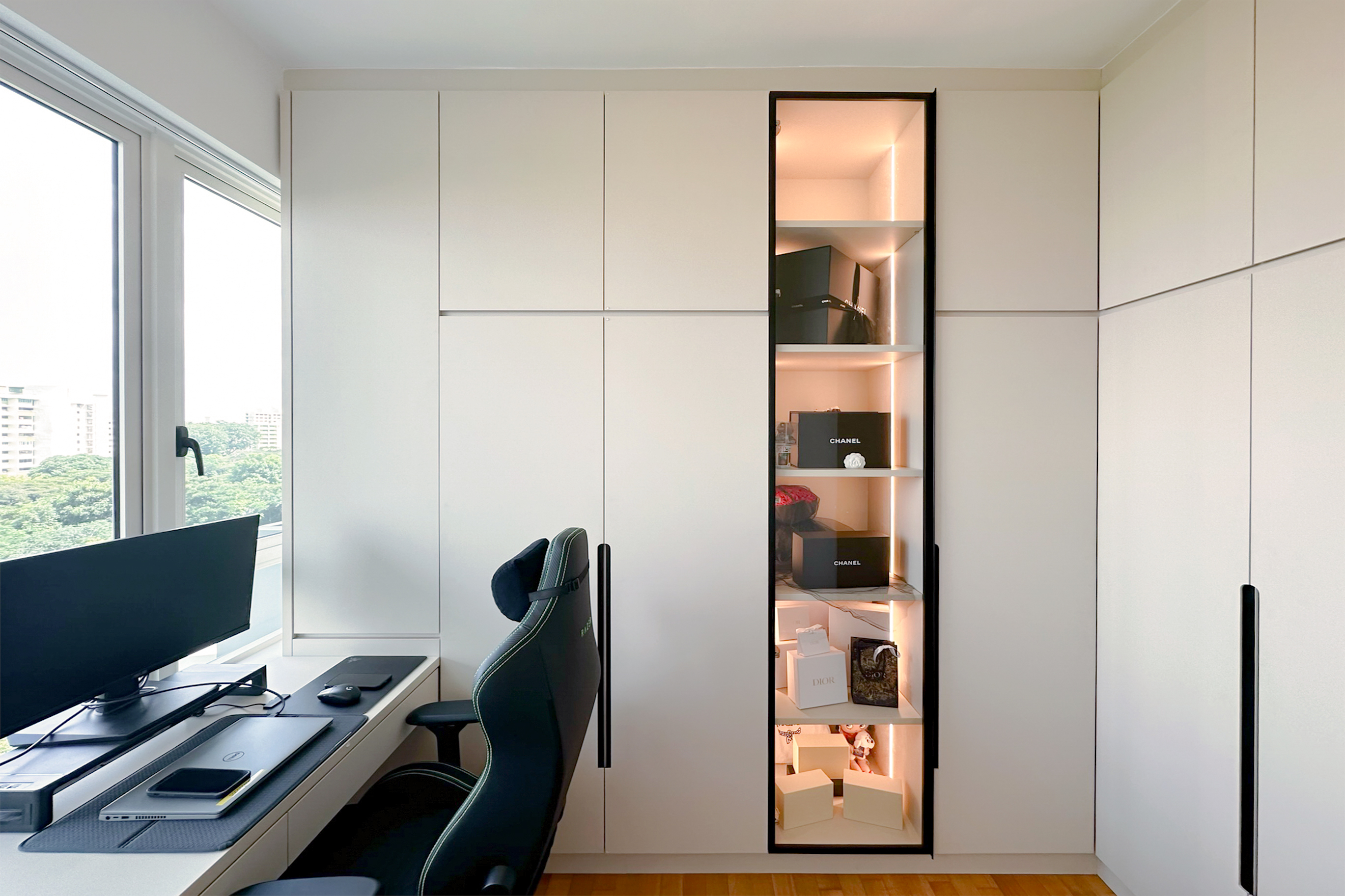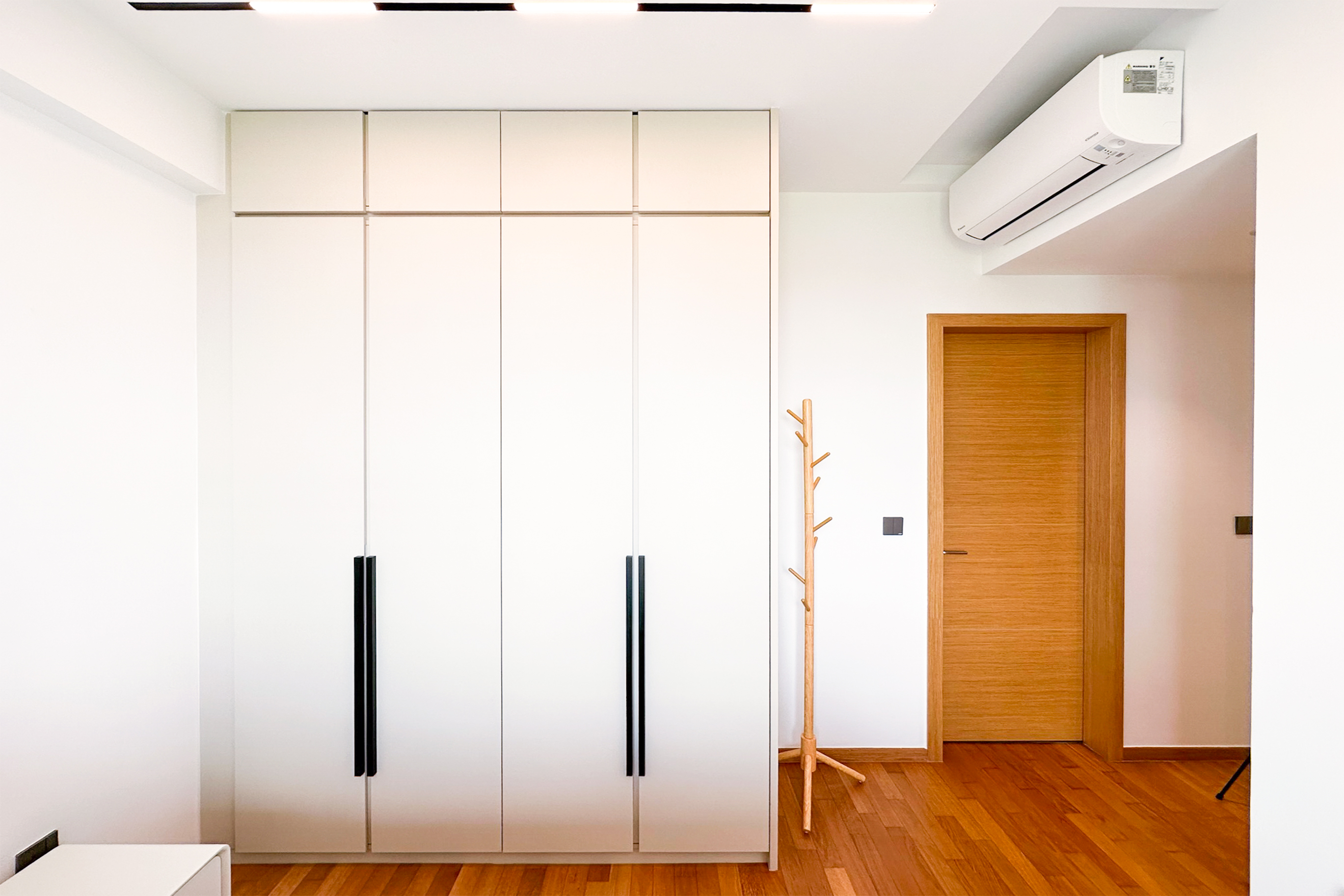 We opted to keep things cosy in this small 3 room apartment. The existing flooring was retained, but given a new lease of life with a thorough polish. Minimalism principles were strictly adhered to, with carpentry styles kept simple to ensure the space remains timeless. Some additional flair was added to the full height storage cabinets in the study room, necessary to showcase the owner's collection of designer handbags.