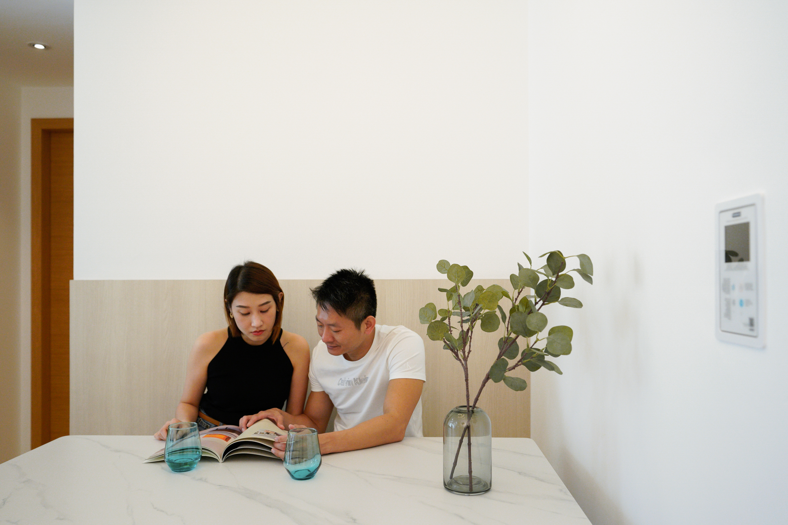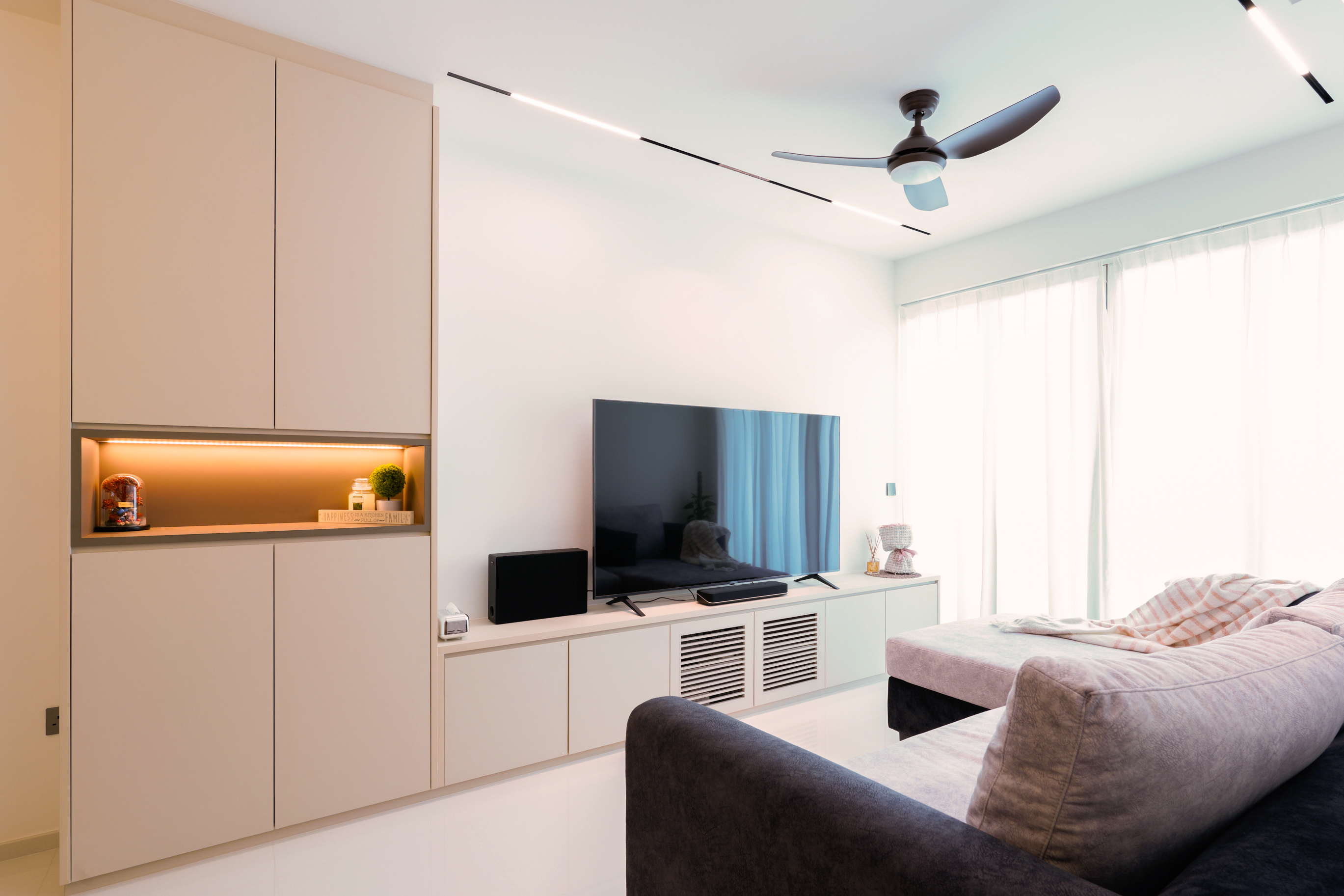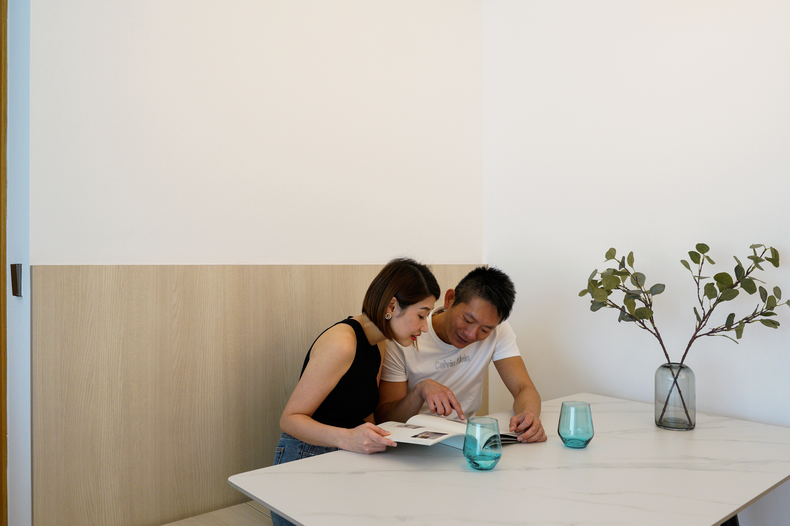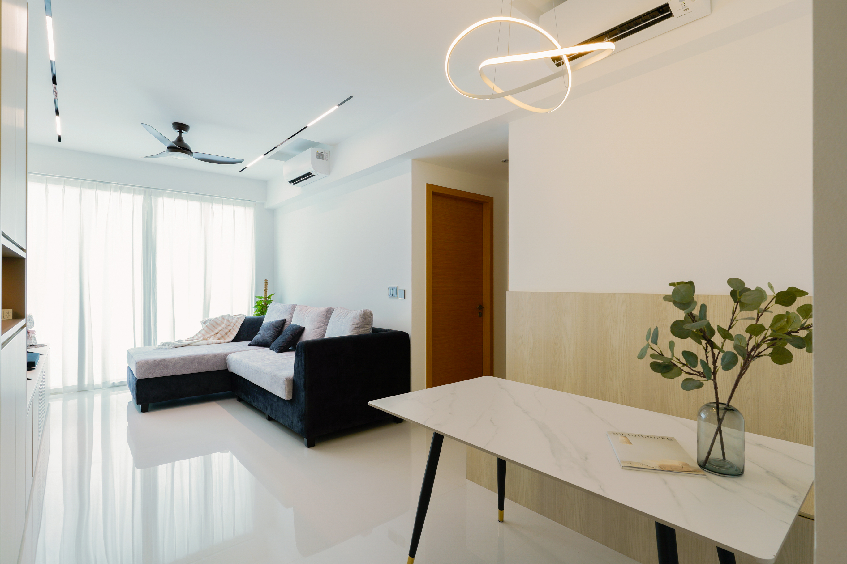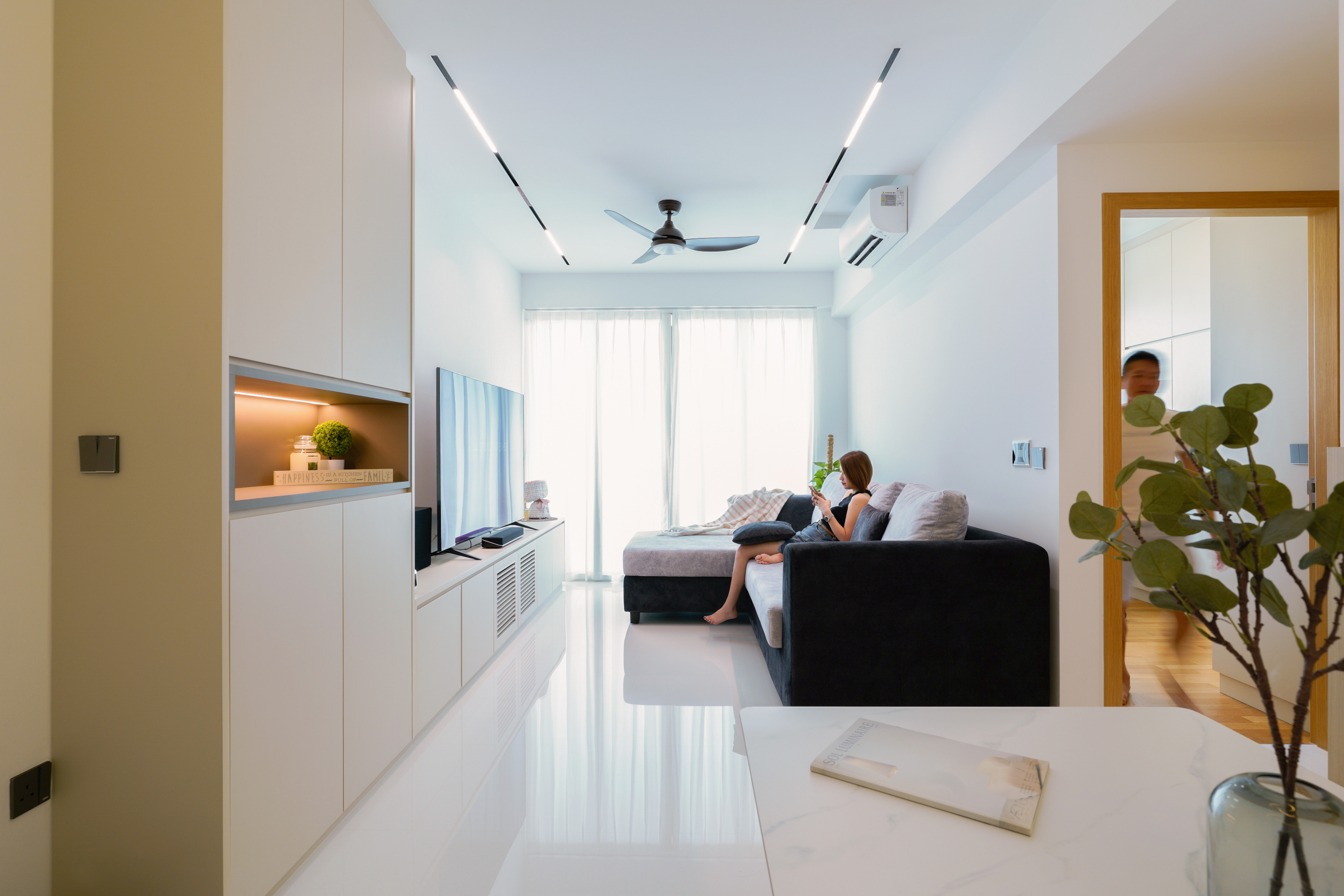 We opted to keep things cosy in this small 3 room apartment. The existing flooring was retained, but given a new lease of life with a thorough polish. Minimalism principles were strictly adhered to, with carpentry styles kept simple to ensure the space remains timeless. Some additional flair was added to the full height storage cabinets in the study room, necessary to showcase the owner's collection of designer handbags.